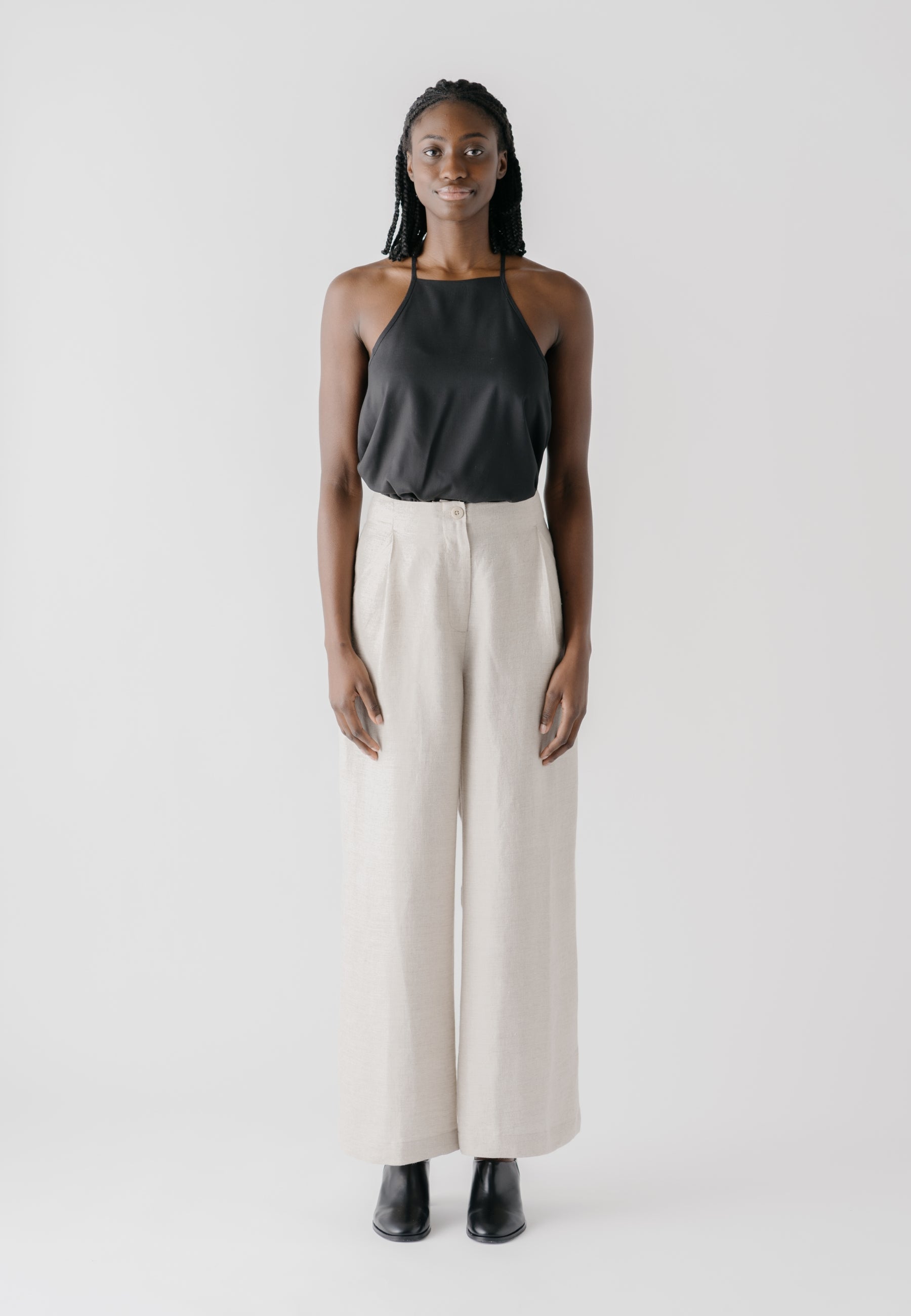 High waisted style with wide, flowing legs for comfort Deep front pleats for a roomy silhouette Hidden waistband for a clean look at the front Side pockets that blend in with the pleats Patch pockets at back Decorative seams and vent details at back Decorative and durable top stitching details for longevity Eco-friendly button