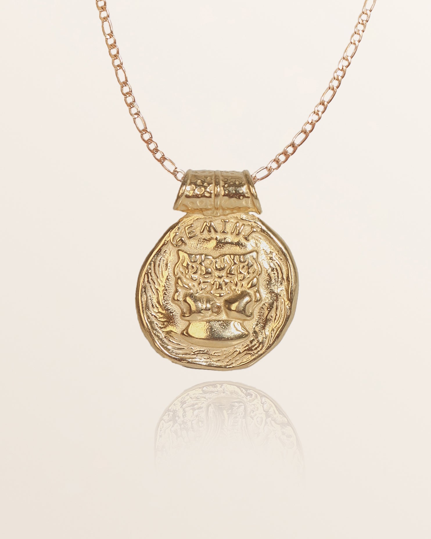 Discover our Star Sign Necklaces. This hammered gold coin is uniquely designed for the Gemini sign. Crafted from 18ct gold-plated material, these waterproof coins are the perfect statement piece, whether worn solo for a bold look or layered with another gold necklace. This gold pendent necklace is a perfect alternative to a May birthstone or June birthstone necklace.