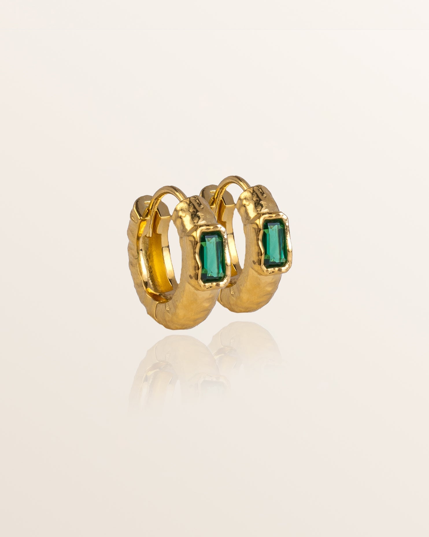 Our signature hammered texture and vibrant green gemstone puts a fresh twist on the classic gold hoop. Wear alone or stack with our cult-favourite chunky hoops.
