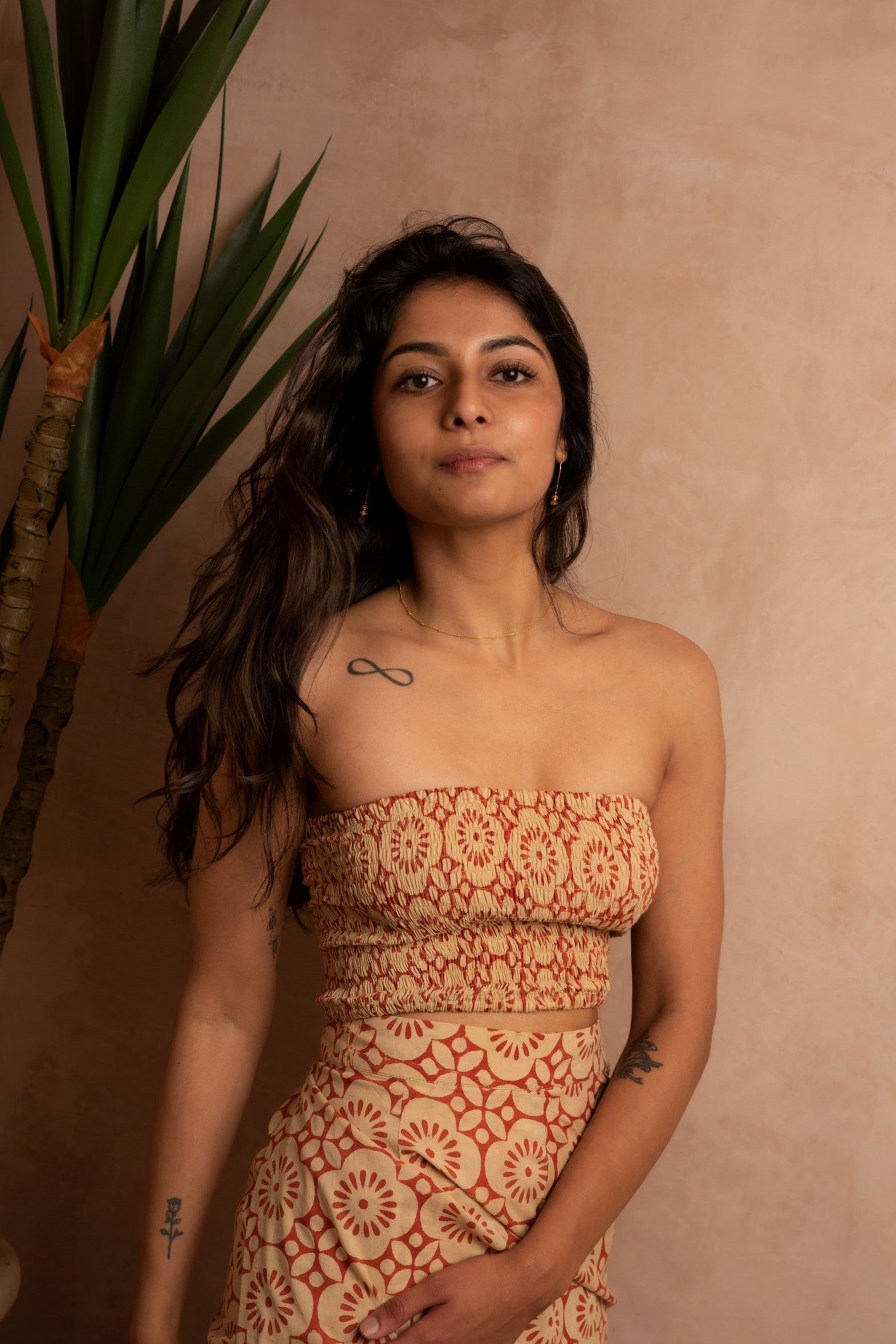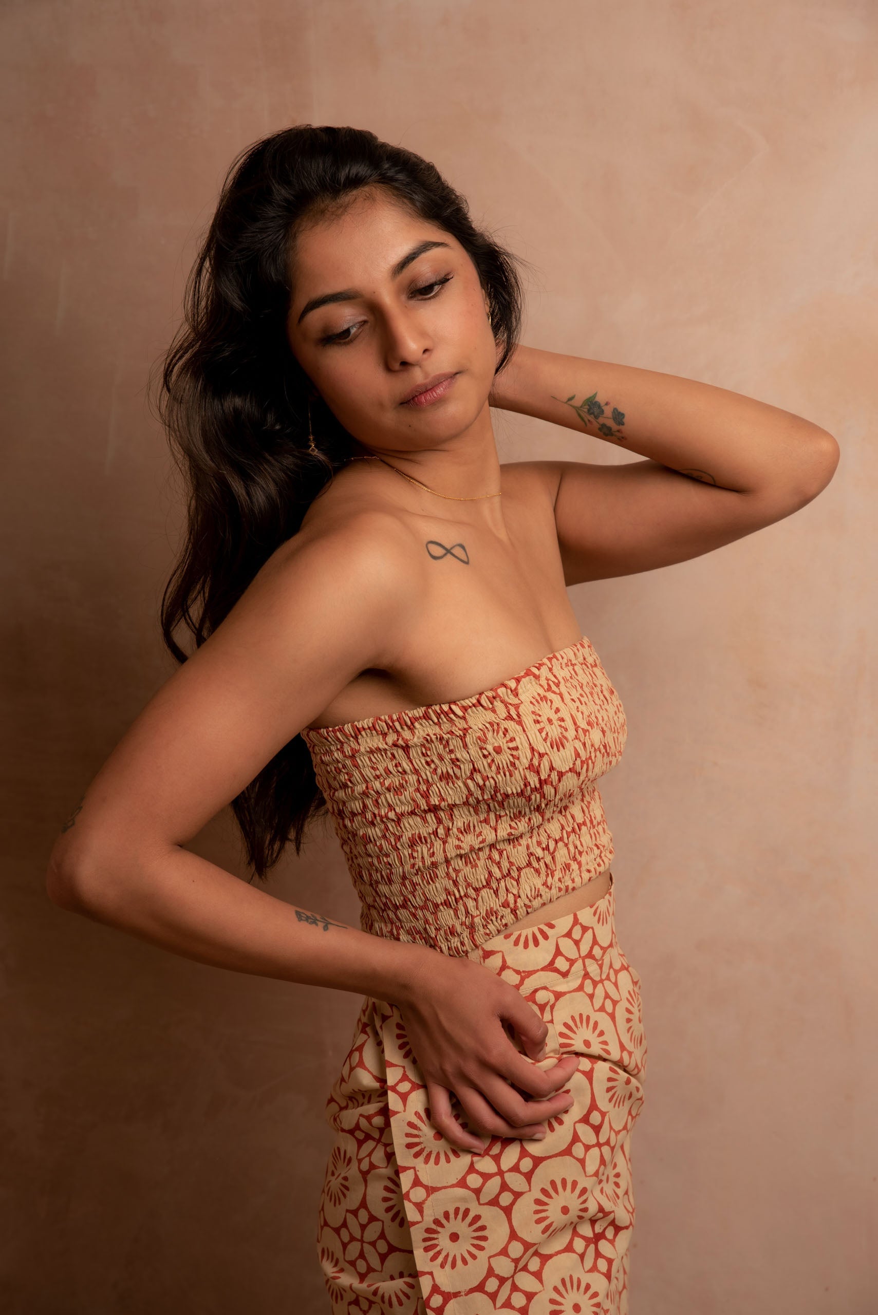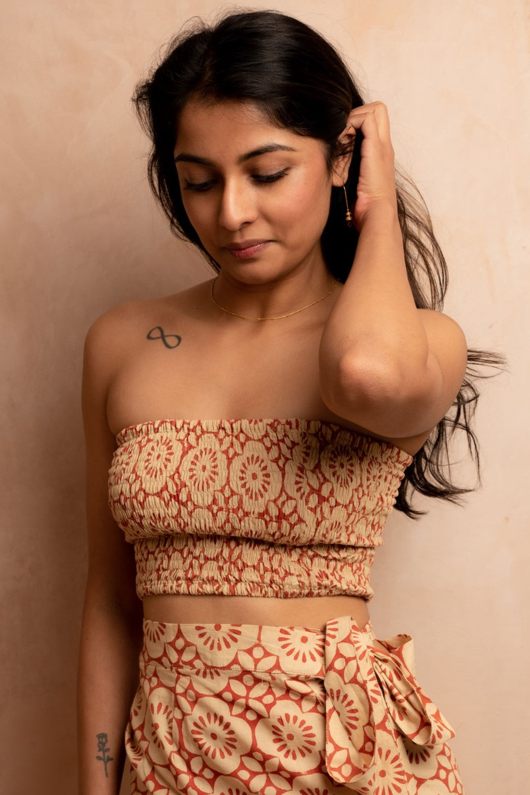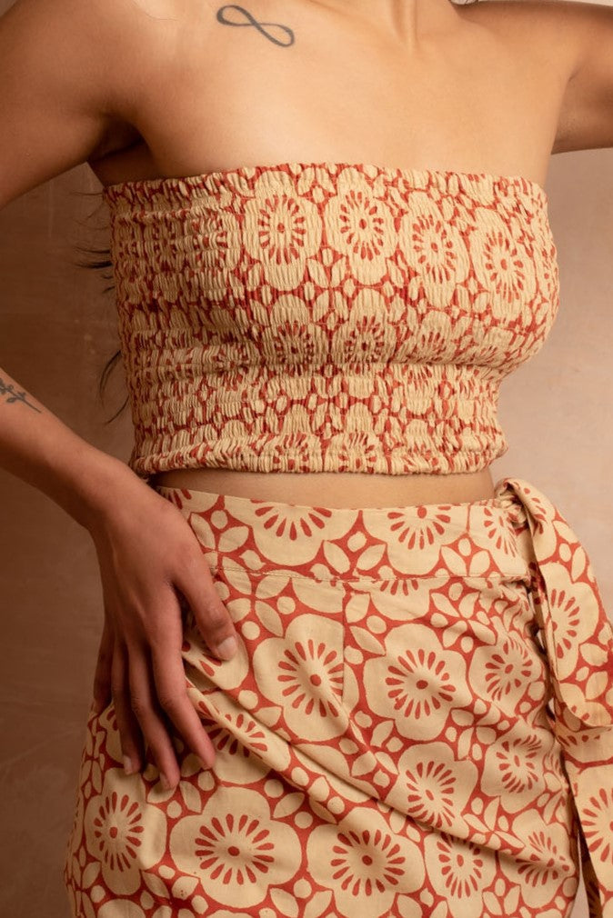 Our versatile best-selling bandeau top in luxurious cinnabar Indian cotton hand block printed with creamy geometric pomegranate patterns.