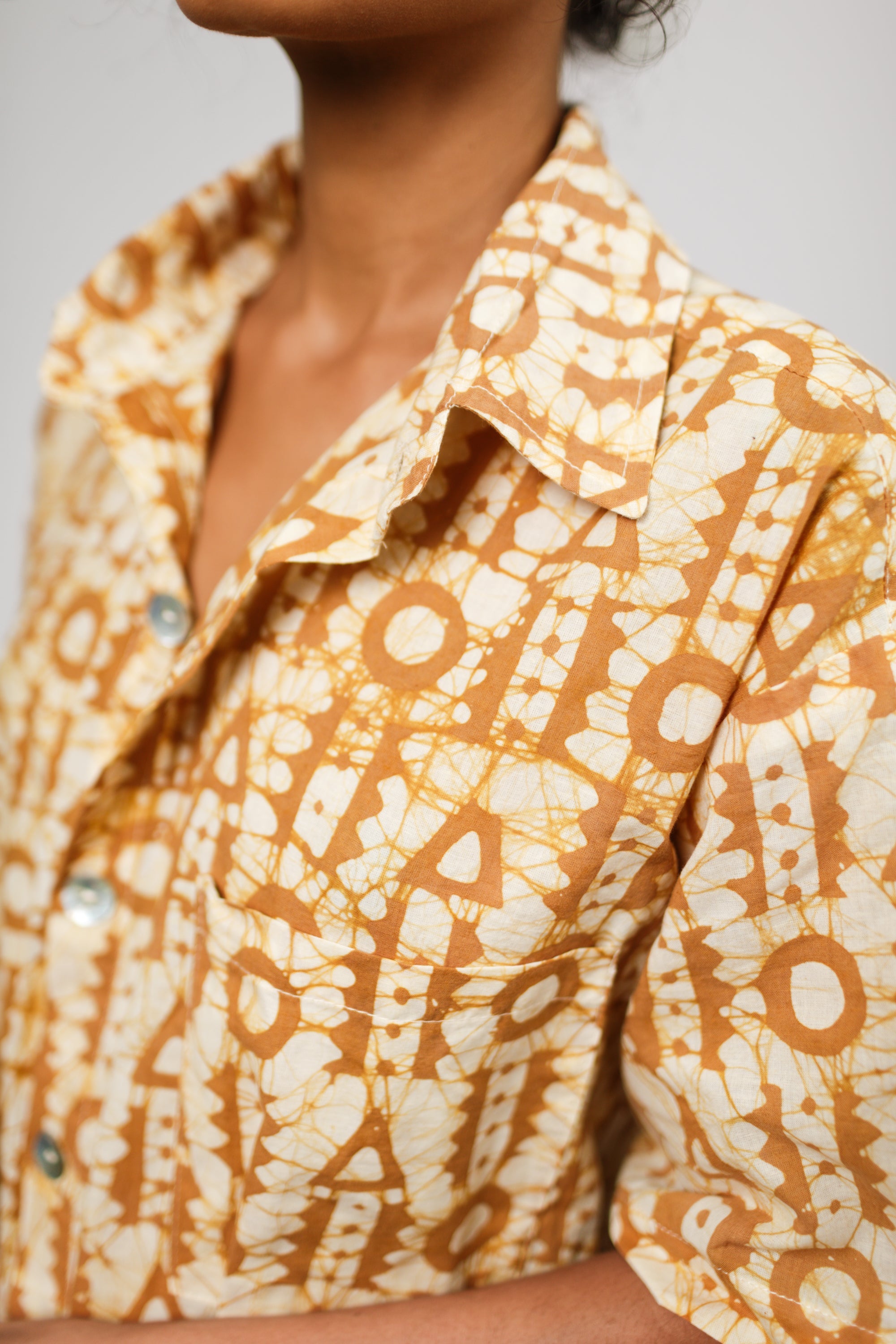 This is our gorgeous oversized shirt in sunny geometric mango block print on luxuriously light Indian cotton.
