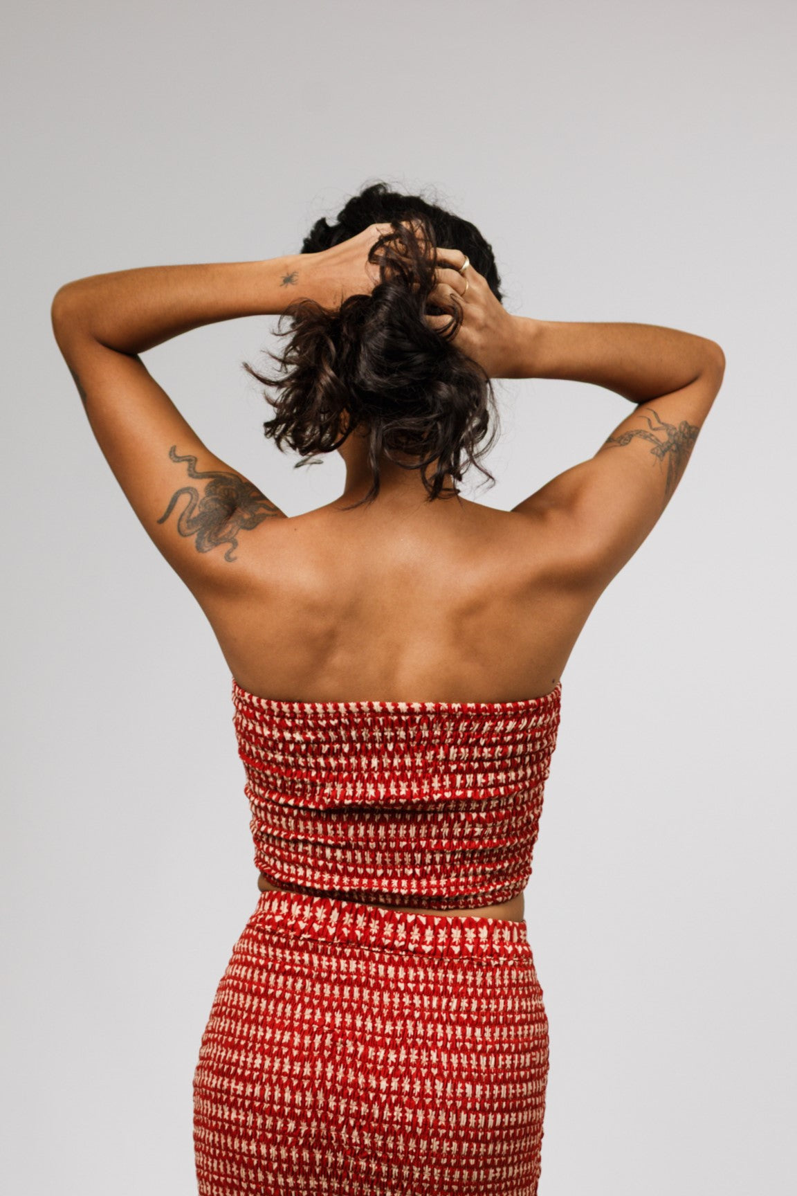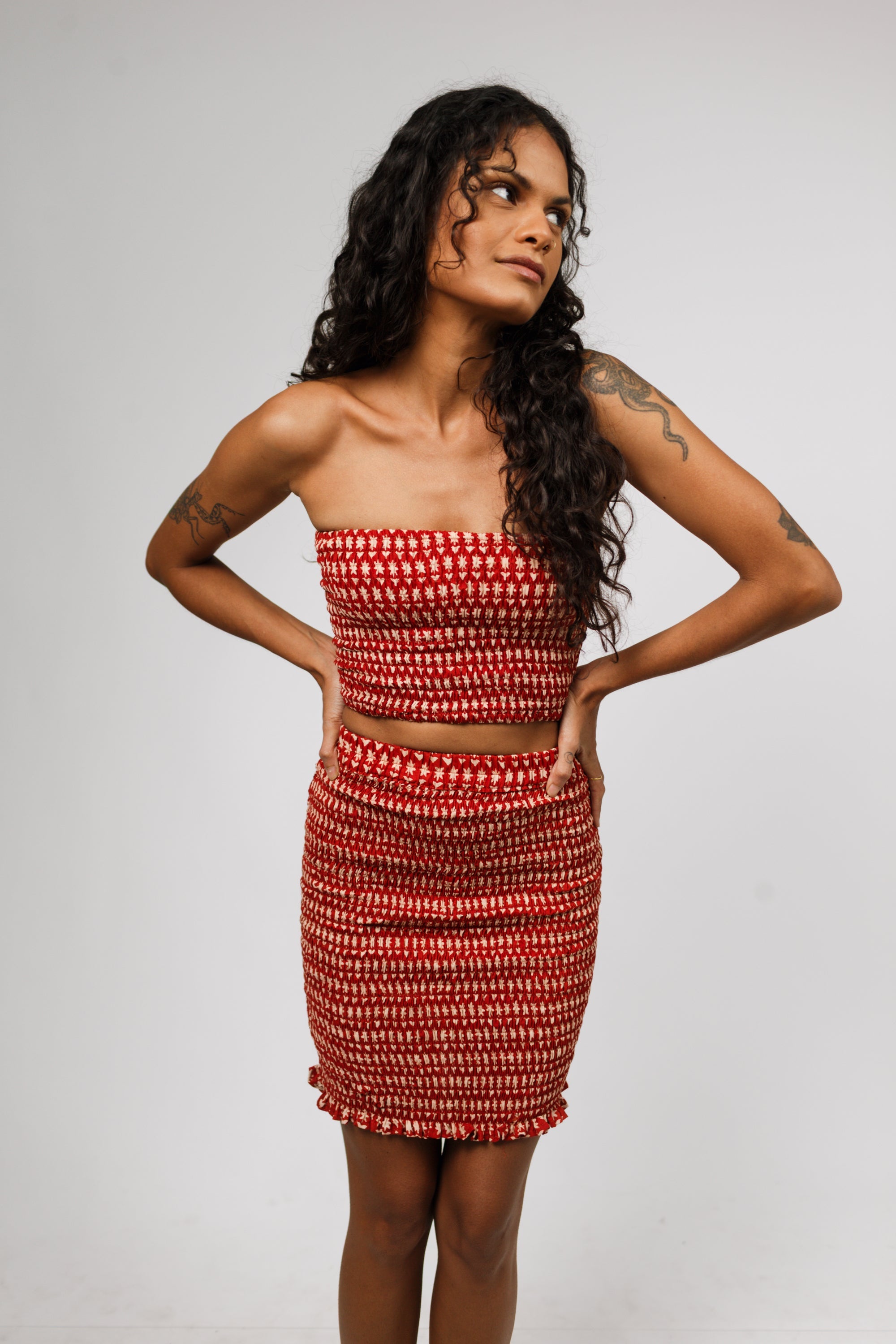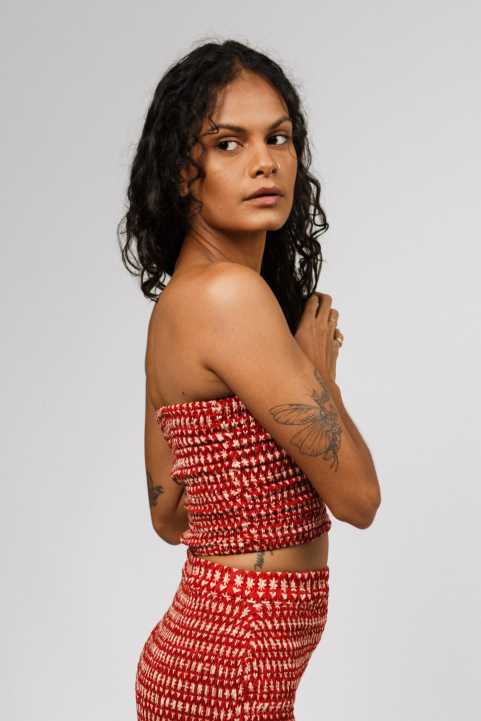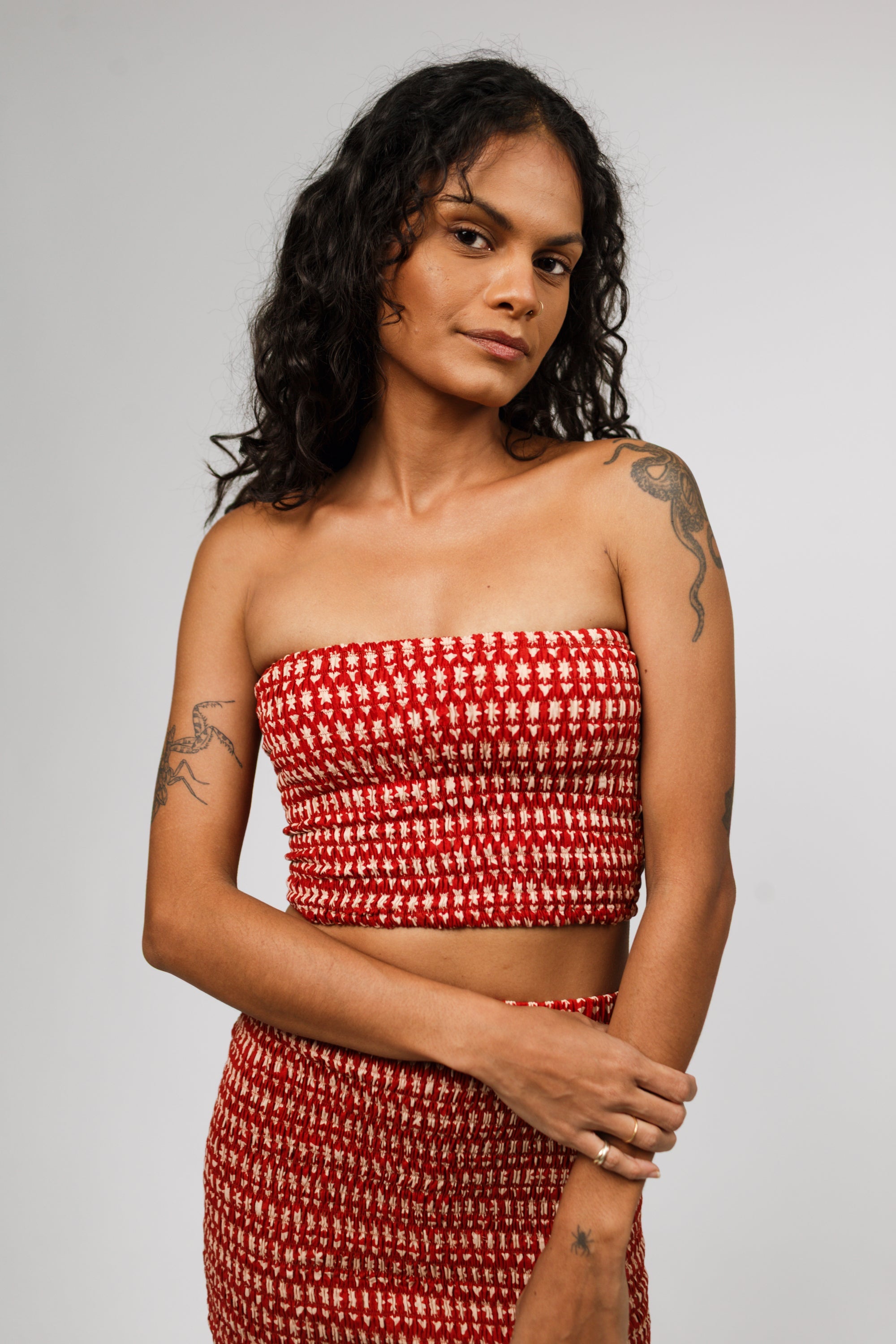 Our versatile best-selling bandeau top in luxurious crimson Indian cotton hand block printed with white starry blossoms.