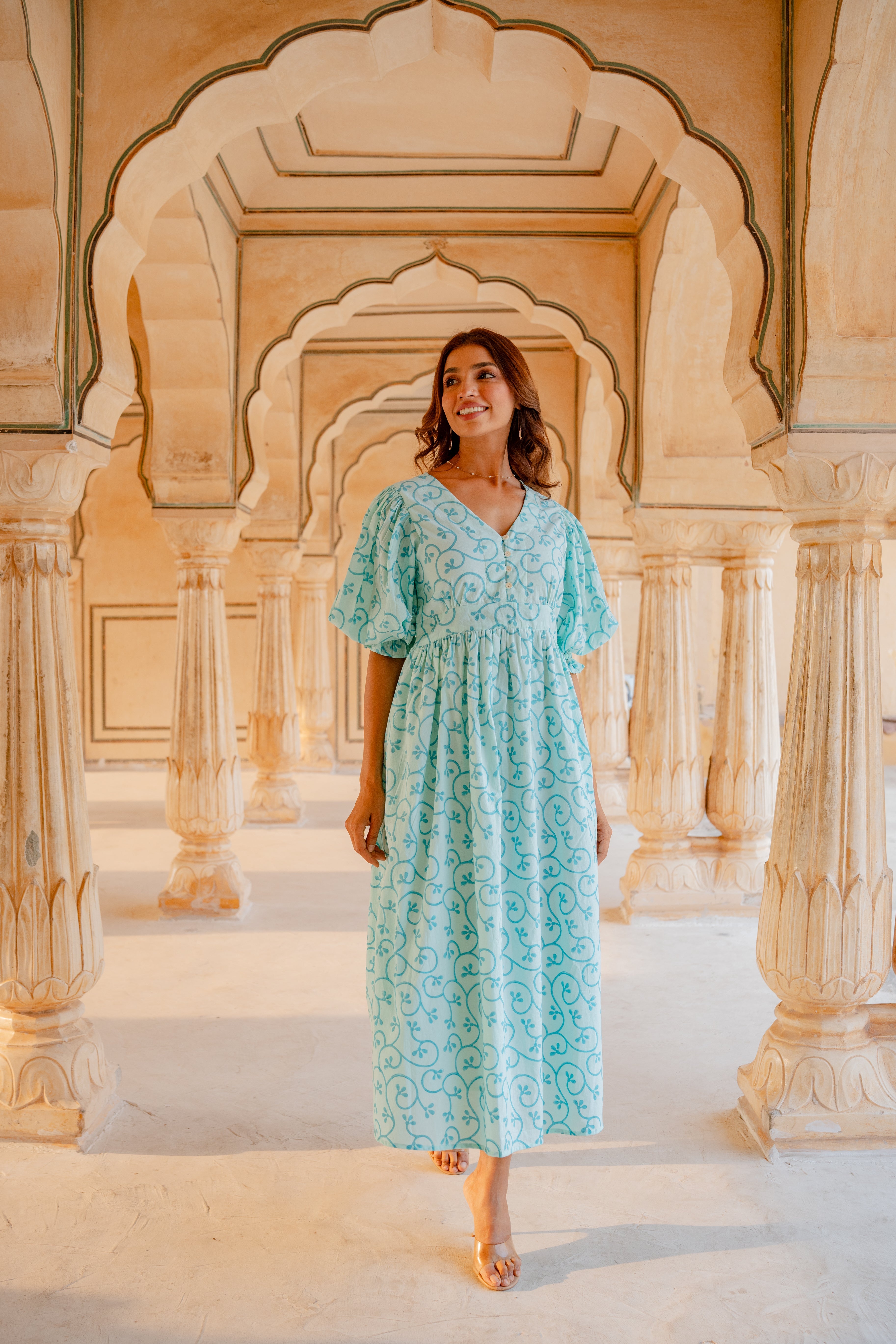 The Beatrice Dress is a dreamy addition to your wardrobe. Made from luxuriously soft organic cotton with a puffed sleeve and gently fitted waist with smocking at the back. Versatile and flattering, the perfect dress for spring!