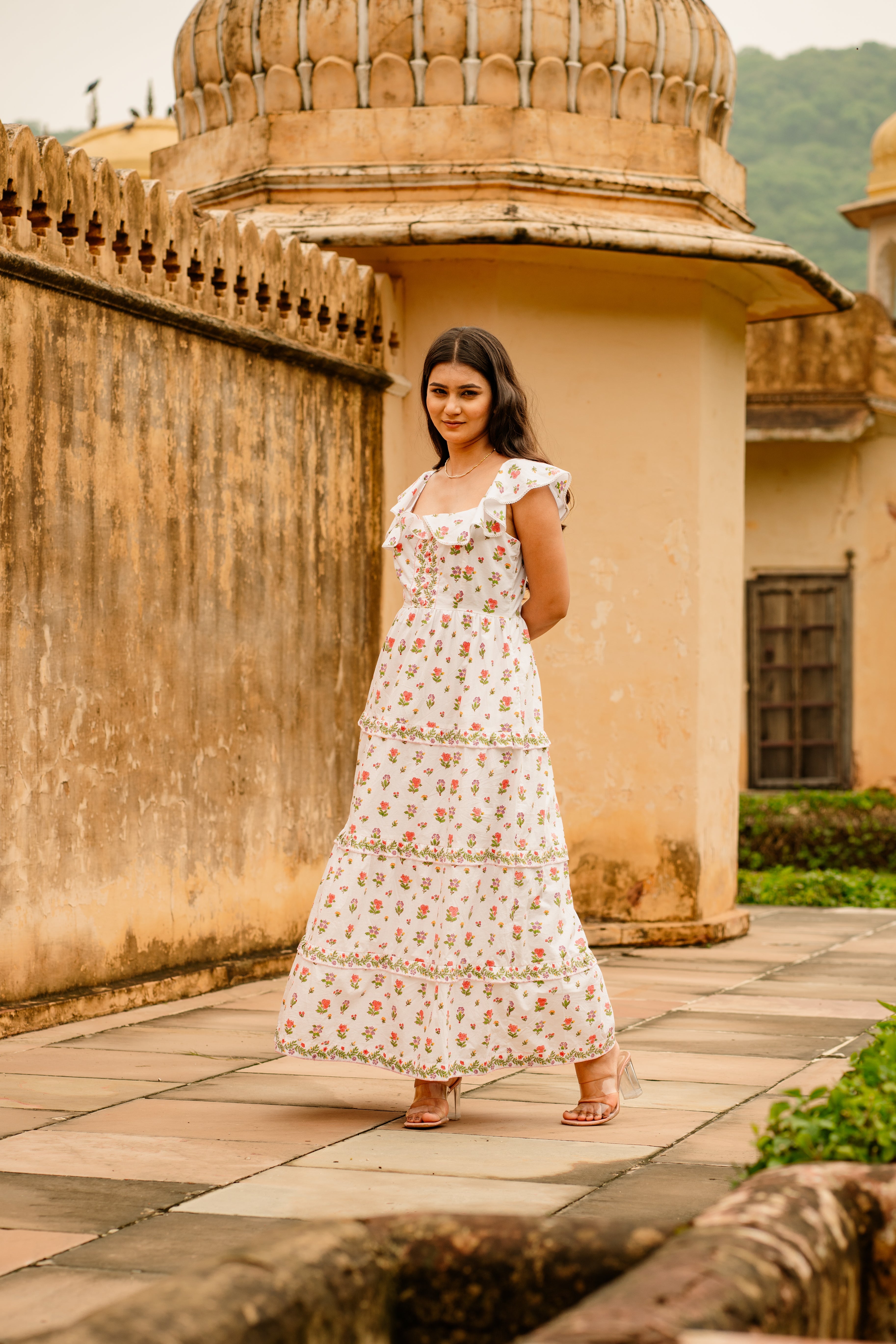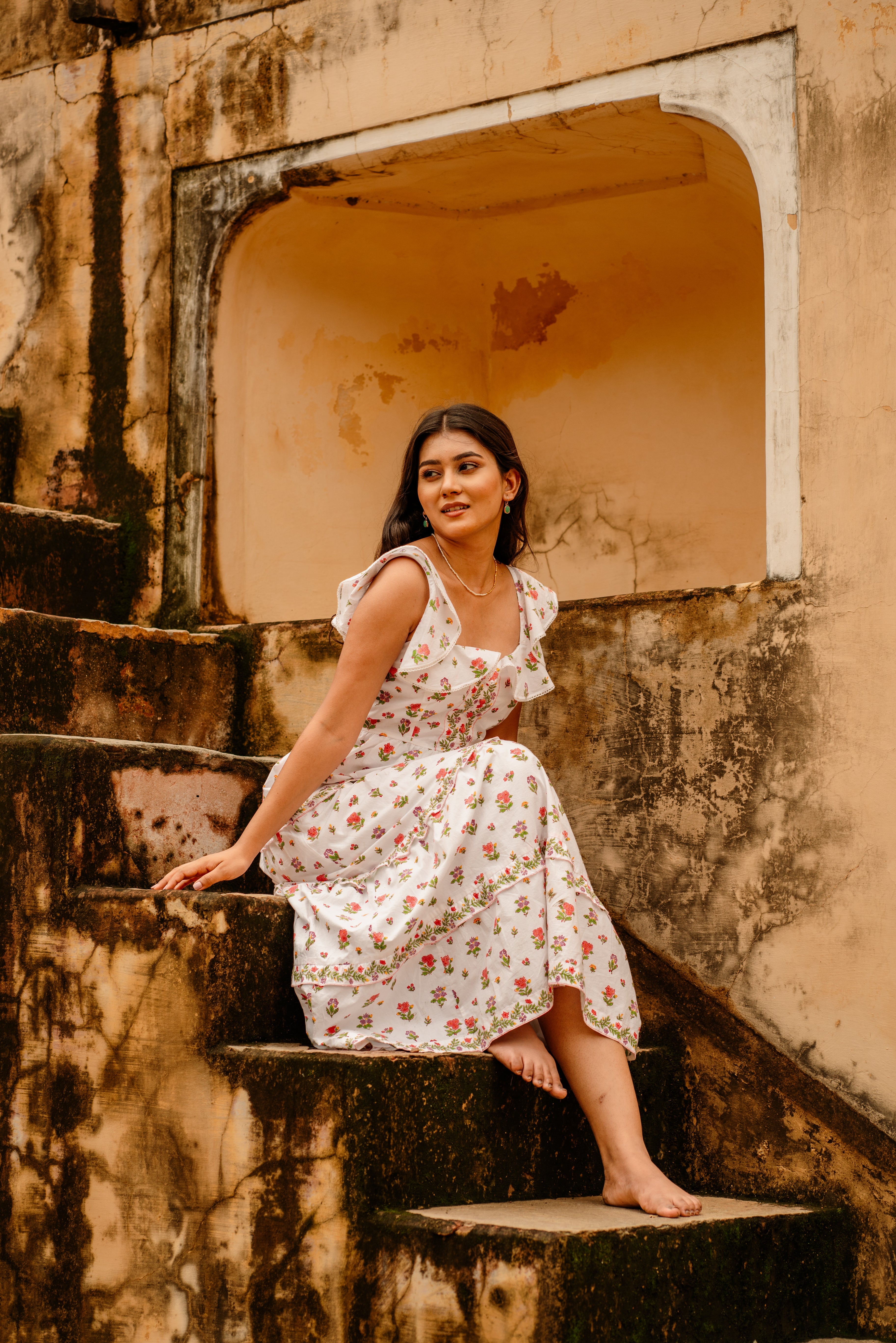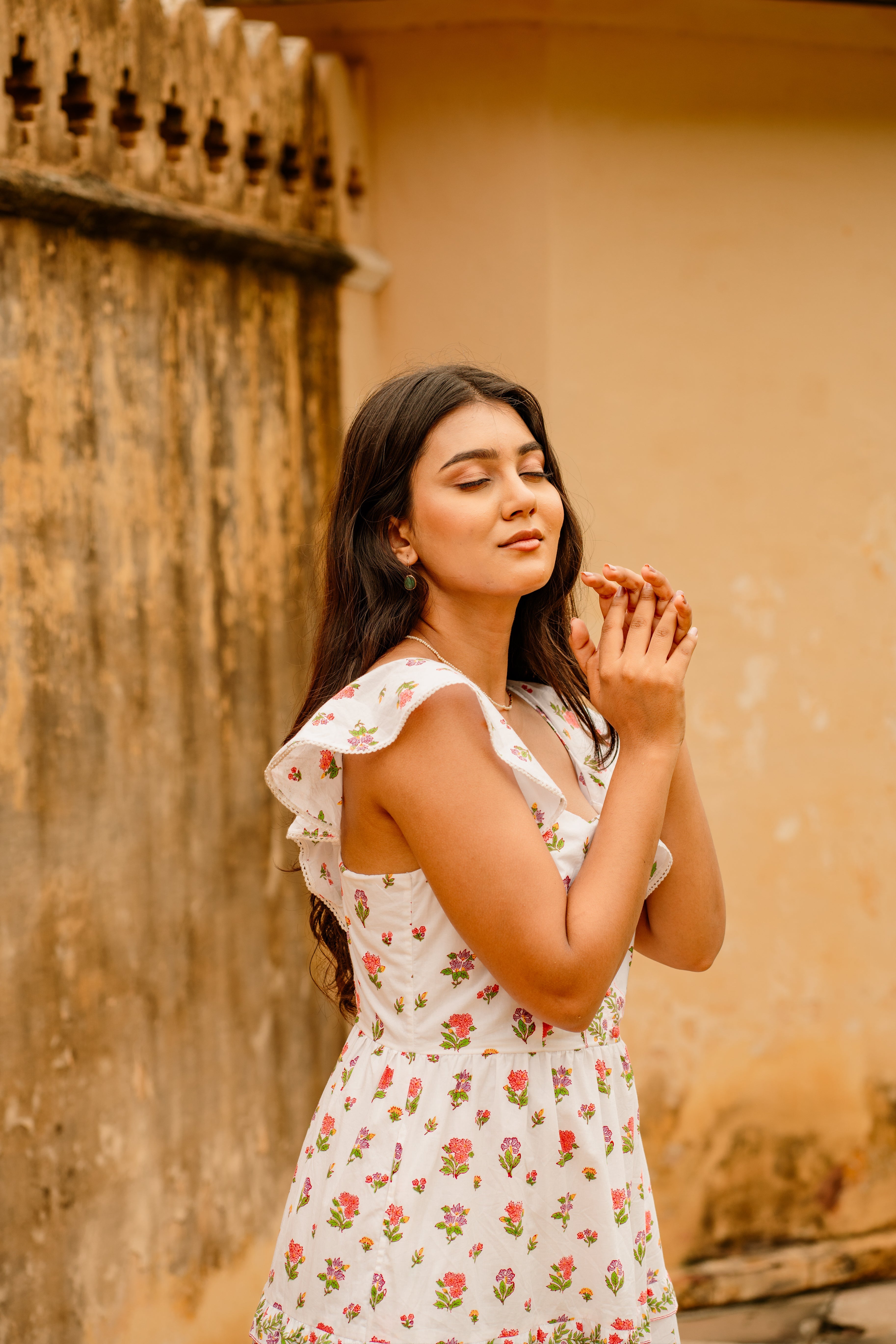 Block-printed by hand in our beautiful summer meadow print, the Pandora dress is a stunning addition to your wardrobe. Made from organic cotton poplin, and featuring a  ruffle around the neck, a gently fitted waist and delicate lace details. We love the border contrast on the hem. Dress up for events or pair with trainers for a more relaxed day look.