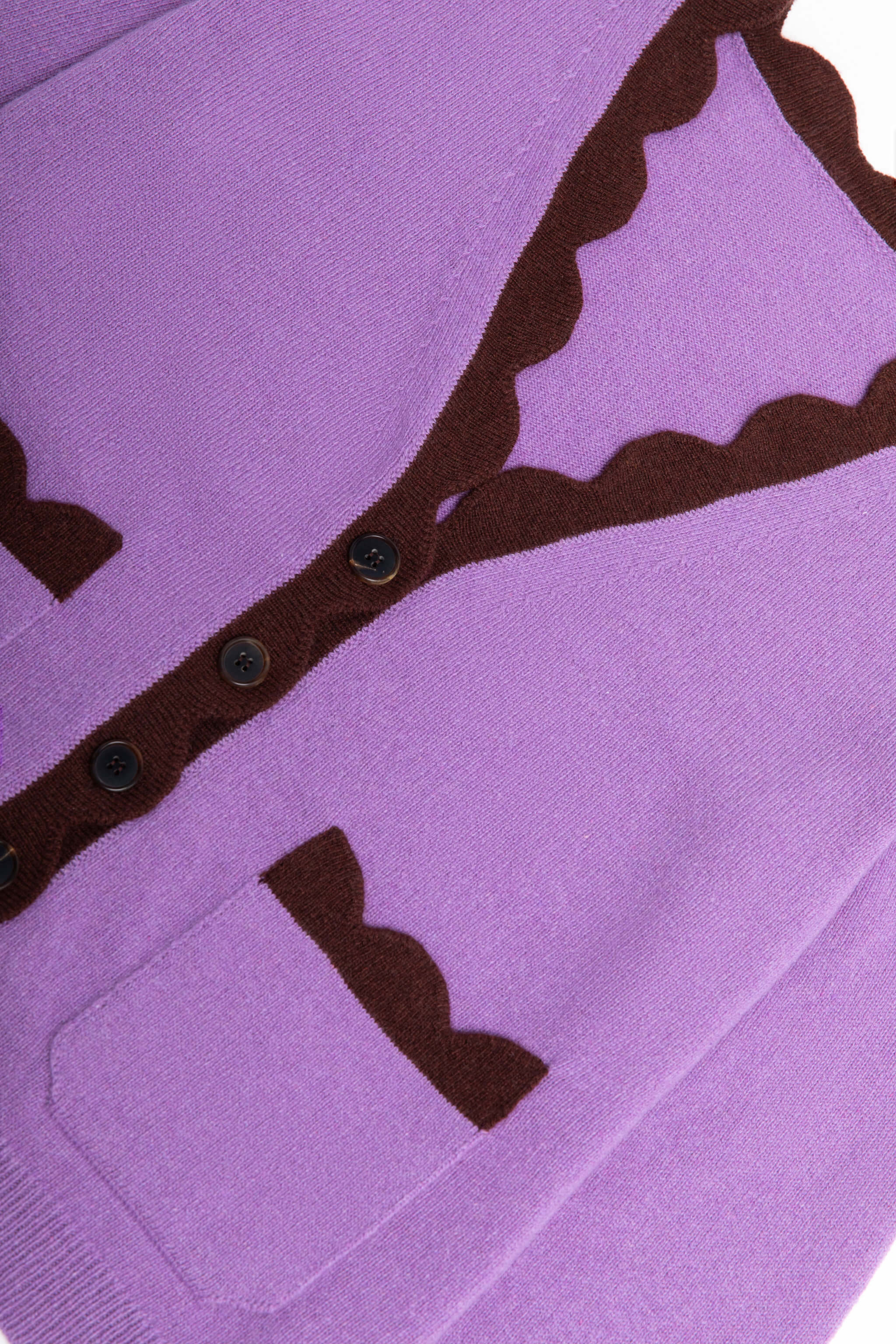 This bi-colour cardigan, highlighted by the signature scallop edge design on its patch pockets and placket with dropped shoulders, offers a relaxed fit. With a uniquely designed placket, this cardigan showcases scallop edges on both sides, allowing for a stunning scallop design when worn unbuttoned. It's a forever heirloom piece meant to elevate your everyday wardrobe.