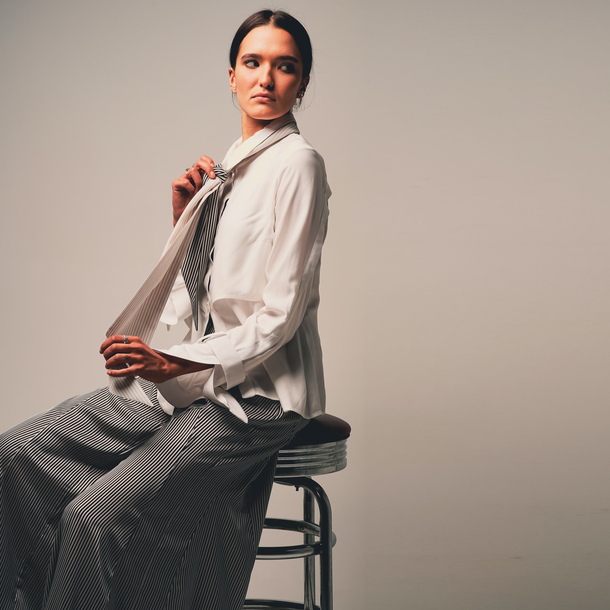 I love styling my outfits with neck ties. We created this accessory through using the remnants of fabric from creating the ‘Interrupted’ collection. I love to wear mine with the Bamboo Shirt to elevate my daytime outfit