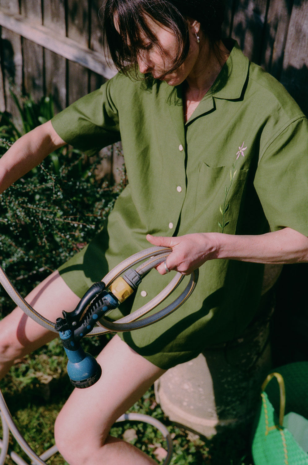 A unique take on the classic Cuban shirt styling, the Frances Shirt in this beautifully rich olive green, has a structured fluidity that brings an elegance to this relaxed style. A unisex fit, this easy short sleeve shirt is cut to suit both the male and female frame. This softly textured blend of viscose, linen and cotton has a luxe light slub running through the cloth; on the reverse side inside the shirt the back of the cloth is a satin, which feels beautifully silky against the skin, and gives a subtle contrast when you roll the sleeves back.