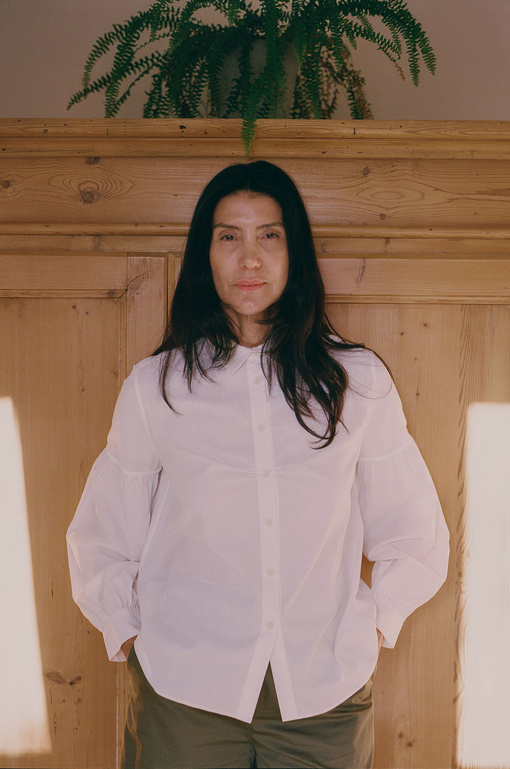 A true wear-forever piece, our Edi shirt is a feminine take on classic white shirting. Cut with a soft gathering at the bust to flatter all shapes, its neat silhouette is contrasted with dramatic full sleeves and lace detailing on the collars. Made from Supima cotton blended with environmentally friendlier bamboo, and finished with natural cream corozo buttons, it’s an essential that can be styled up or down.