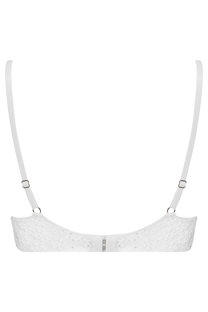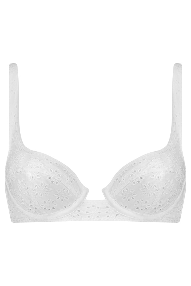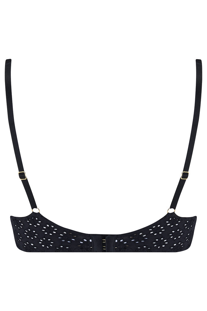 An underwired bra made with 100% organic cotton classic broderie anglaise sourced in Spain, with an organic bamboo trim, and gold plated accessories made in France. Cut for a super flattering vintage look.