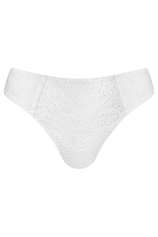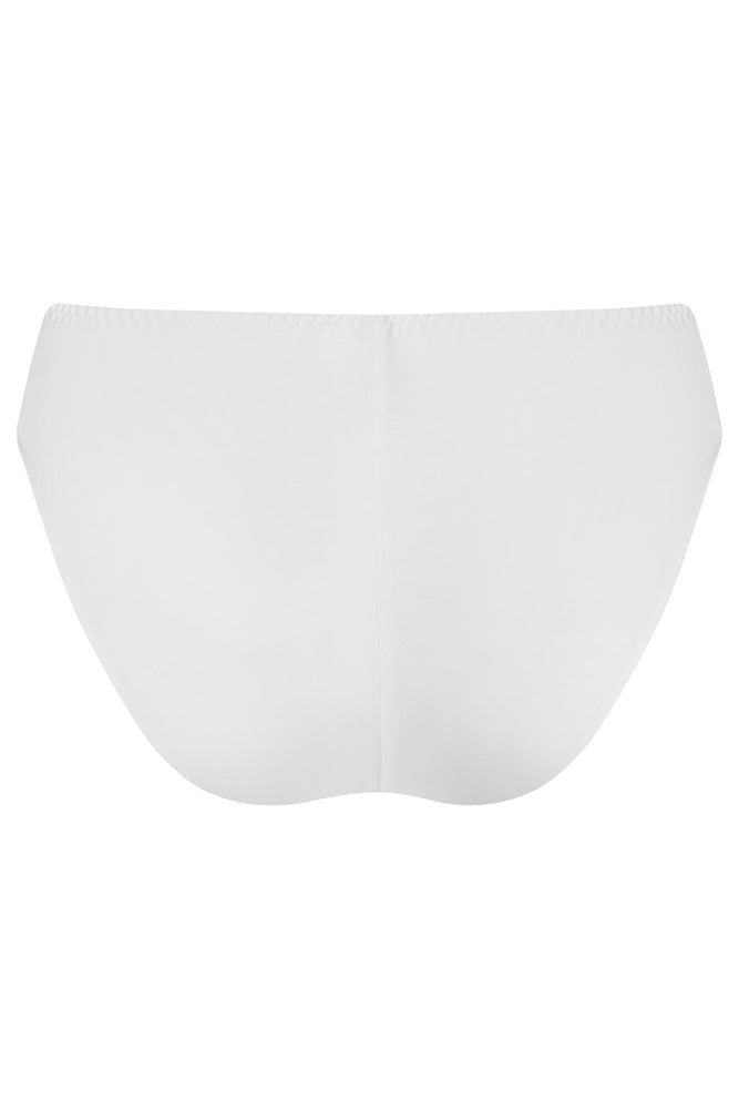 Organic cotton classic broderie anglaise brief with supersoft Portuguese Tencel and organic cotton jersey back. Cut to flatter with a subtle mid rise front and jersey cut on the fold for a smooth back silhouette and no vpl. All our briefs have a fully sewn gusset with covered seams for a supersoft feel.