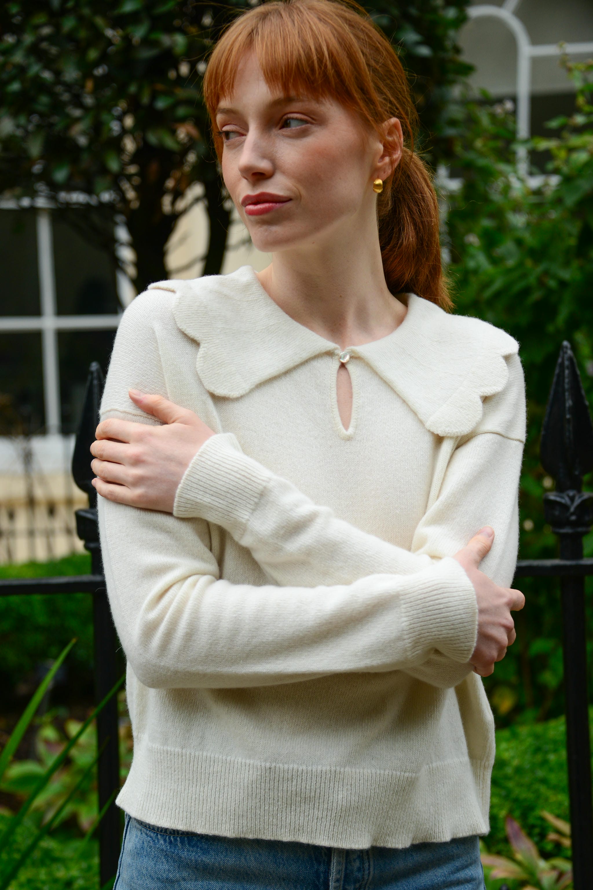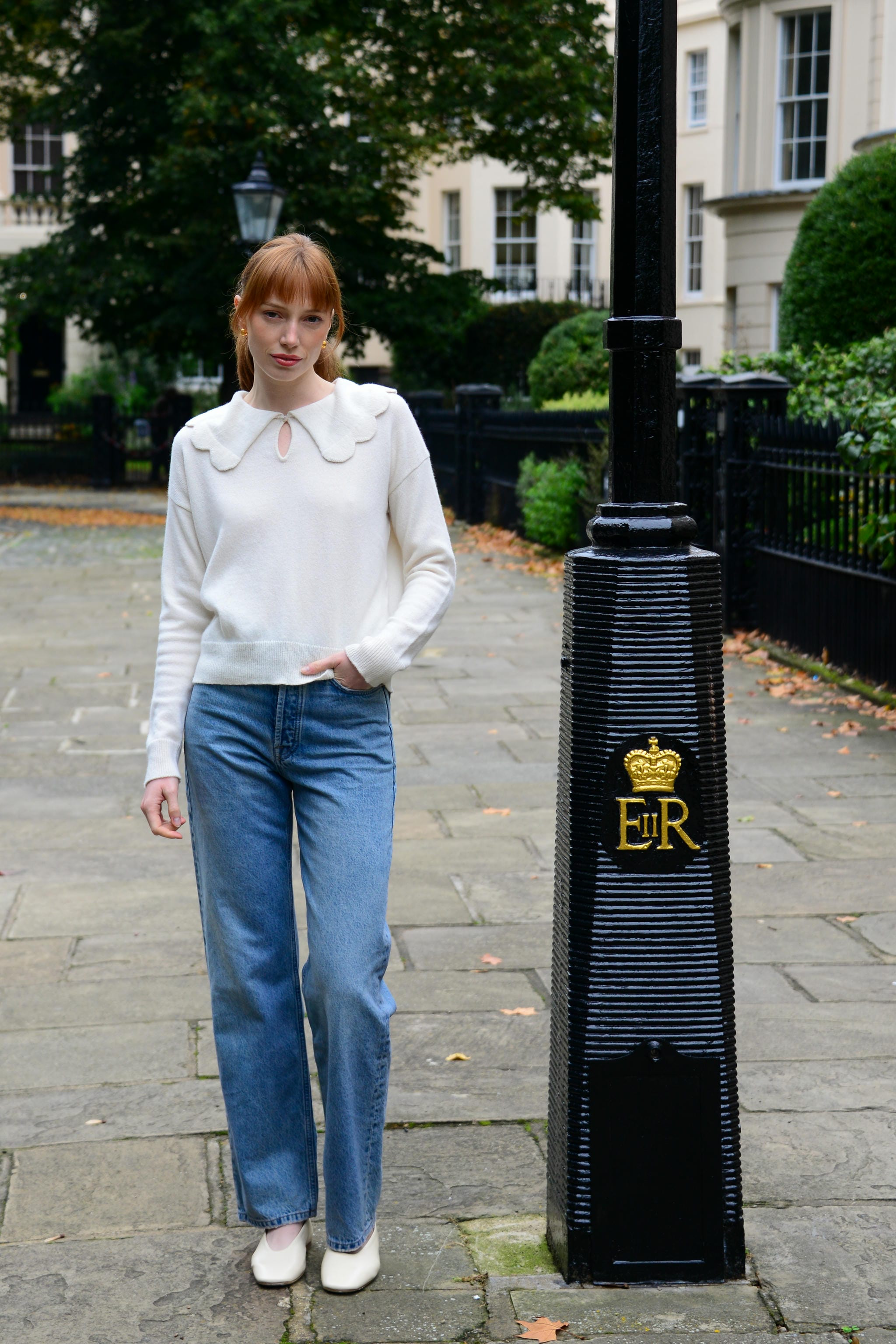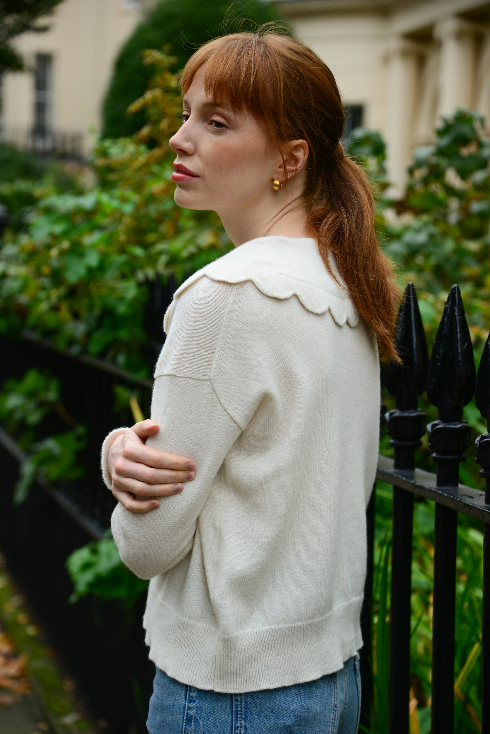 This jumper features our signature scalloped edge design at the collar and dropped shoulders for a relaxed fit. The collar slit is fastened with a stunning real mother-of-pearl button, offering versatility—it can be worn buttoned up or unbuttoned to highlight the neckline, adding a touch of glamour for any occasion. A timeless "forever heirloom" piece, this jumper is designed to effortlessly elevate your everyday wardrobe.
