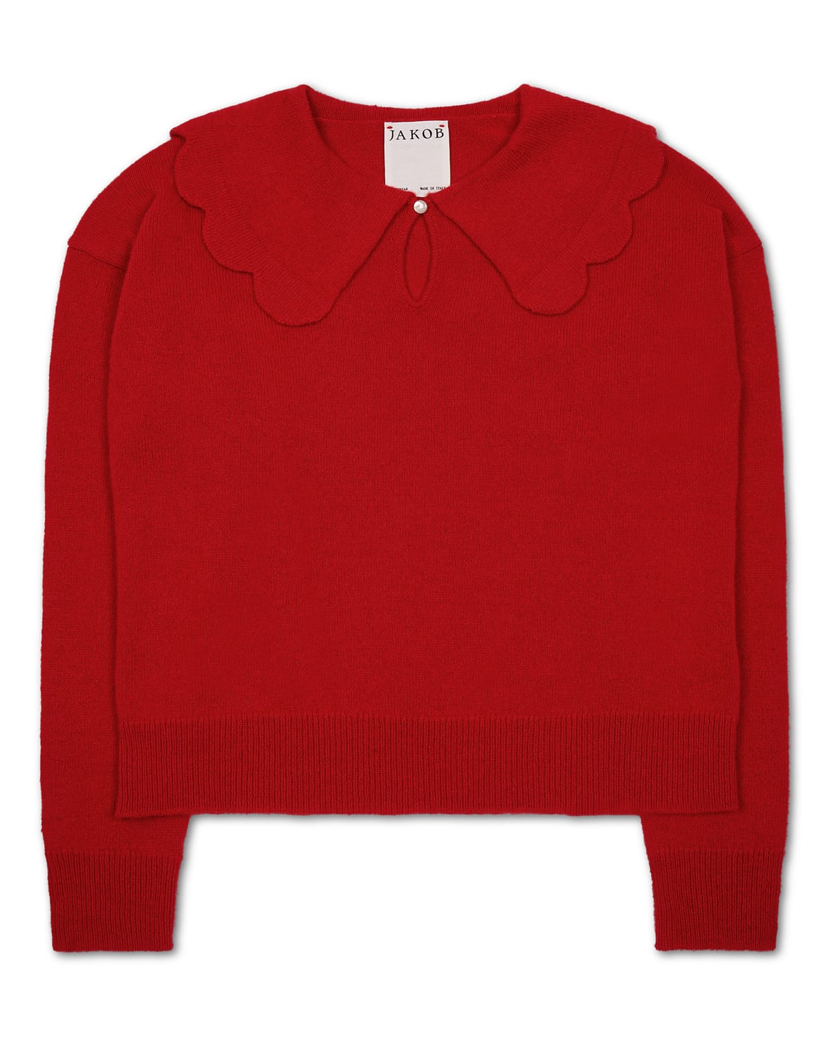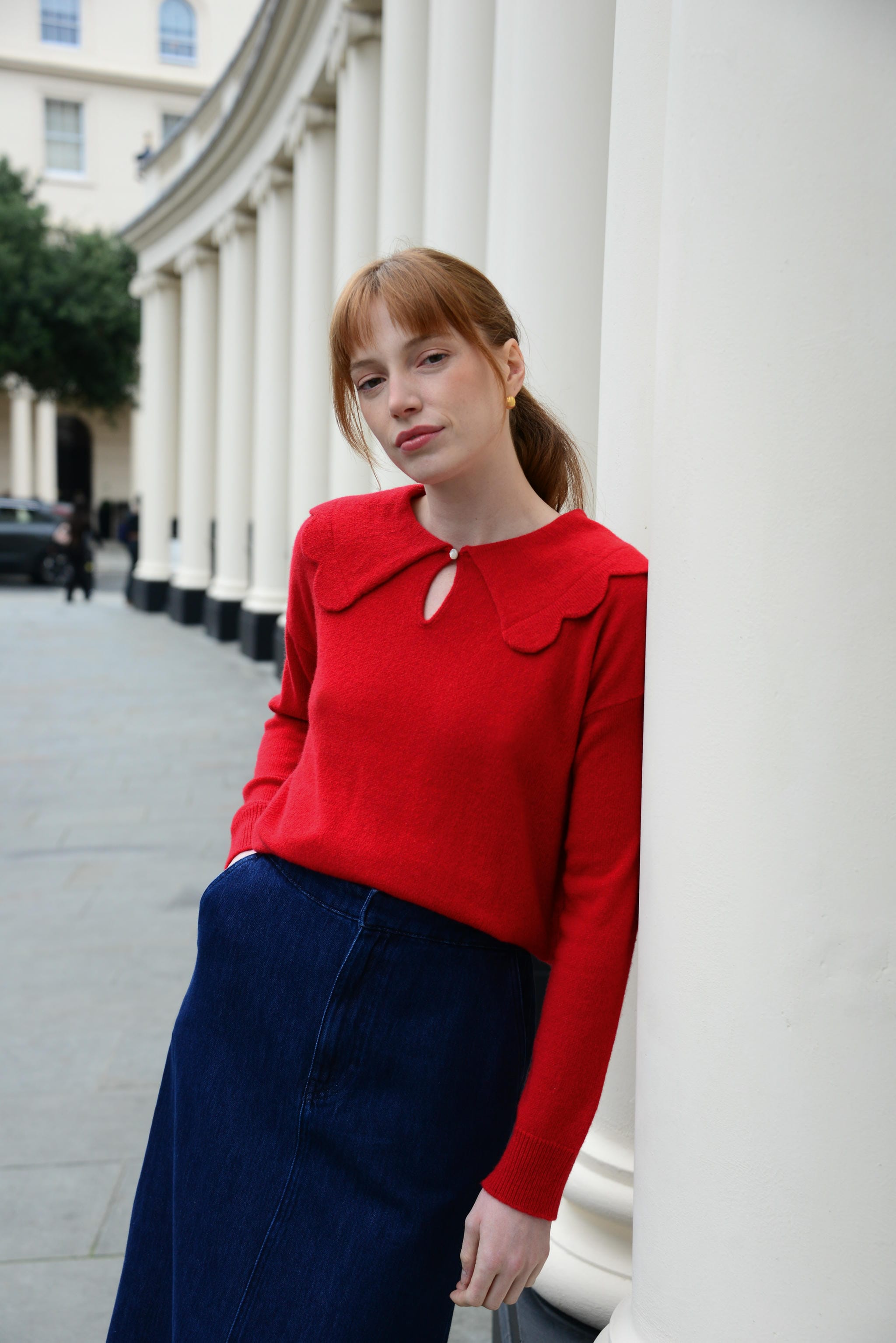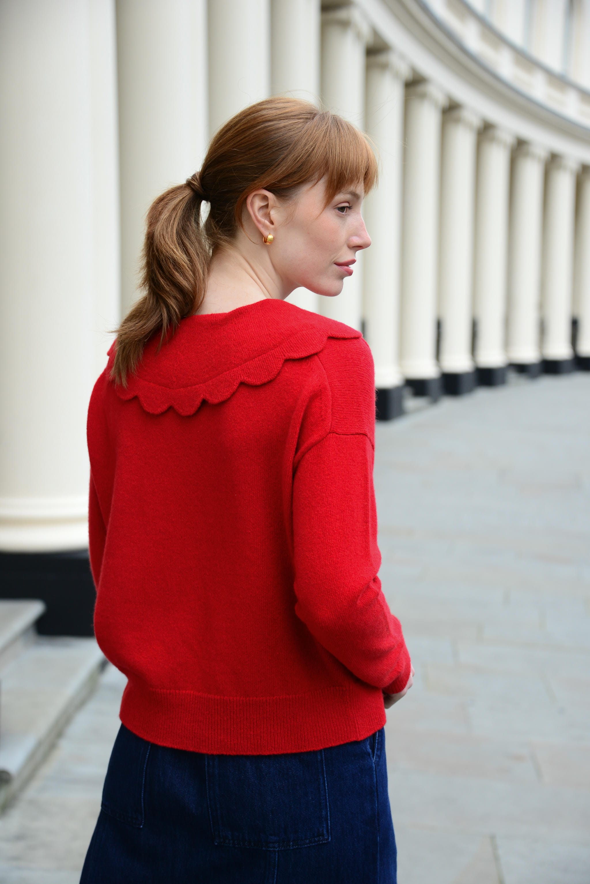 This jumper features our signature scalloped edge design at the collar and dropped shoulders for a relaxed fit. The collar slit is fastened with a stunning real mother-of-pearl button, offering versatility—it can be worn buttoned up or unbuttoned to highlight the neckline, adding a touch of glamour for any occasion. A timeless "forever heirloom" piece, this jumper is designed to effortlessly elevate your everyday wardrobe.